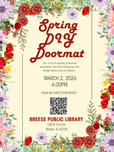 Adult Spring DIY Doormat Session by Jenna Astroth January 19, 2026 0 comments Calendar Add to Calendar Add to Timely Calendar Add to Google Add to Outlook Add to Apple Calendar Add to other calendar Export to XML When: March 2, 2026 @ 6:00 pm – 8:00 pm 2026-03-02T18:00:00-06:00 2026-03-02T20:00:00-06:00 Share