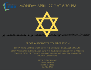 From Auschwitz to Liberation by Jenna Astroth February 23, 2026February 23, 2026 0 comments Calendar Add to Calendar Add to Timely Calendar Add to Google Add to Outlook Add to Apple Calendar Add to other calendar Export to XML When: April 27, 2026 @ 6:30 pm – 7:30 pm 2026-04-27T18:30:00-05:00 2026-04-27T19:30:00-05:00 Share